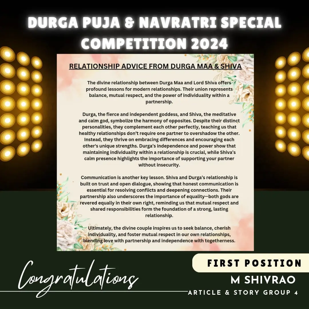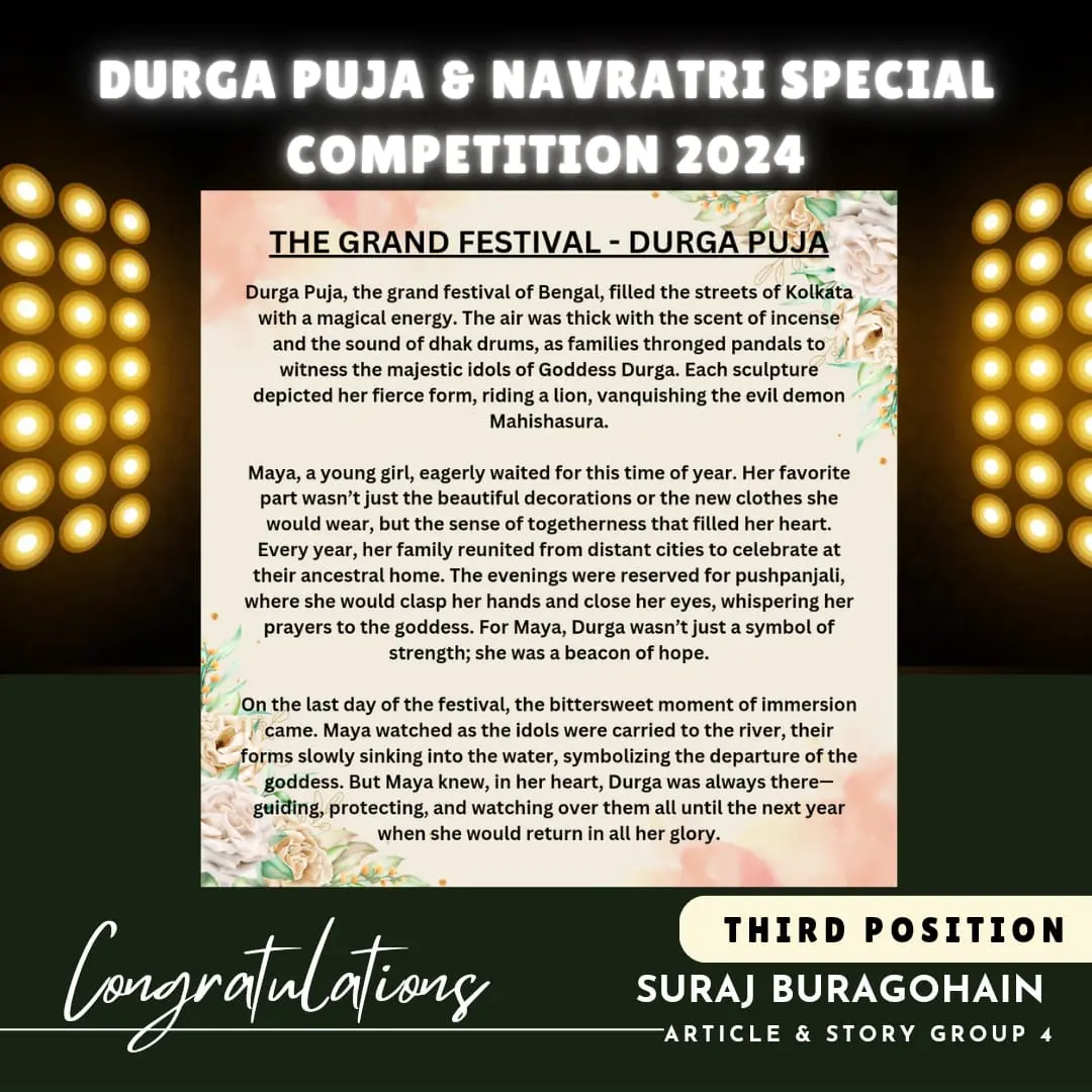 On the auspicious festive occasion of Durga Puja & Navratri Special Competition 2024, we brought to you an awesome competition in different categories for different age groups. Here are the results of the event. Let's make this Festive Season Special !!