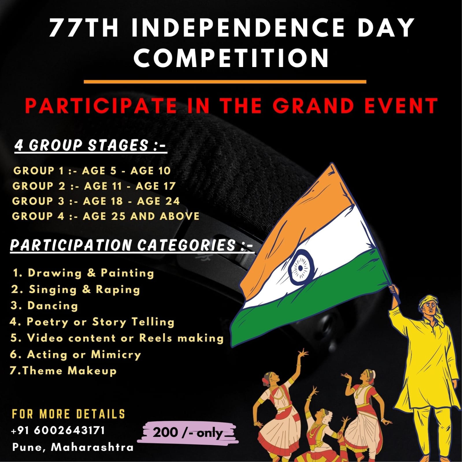 On the auspicious occasion of 77th Independence day of India 2024, we brought to you an awesome competition in different categories for different age groups. Let's make this Independence Day Special !!