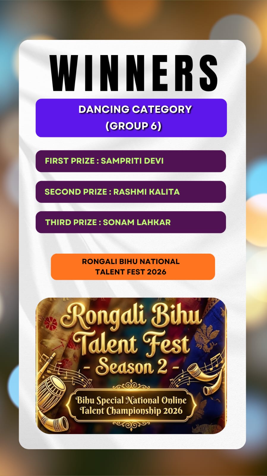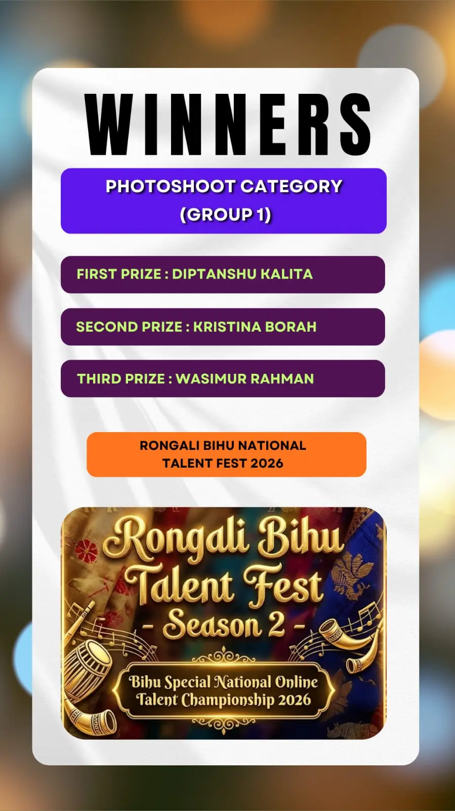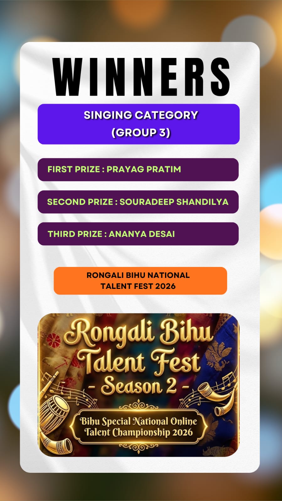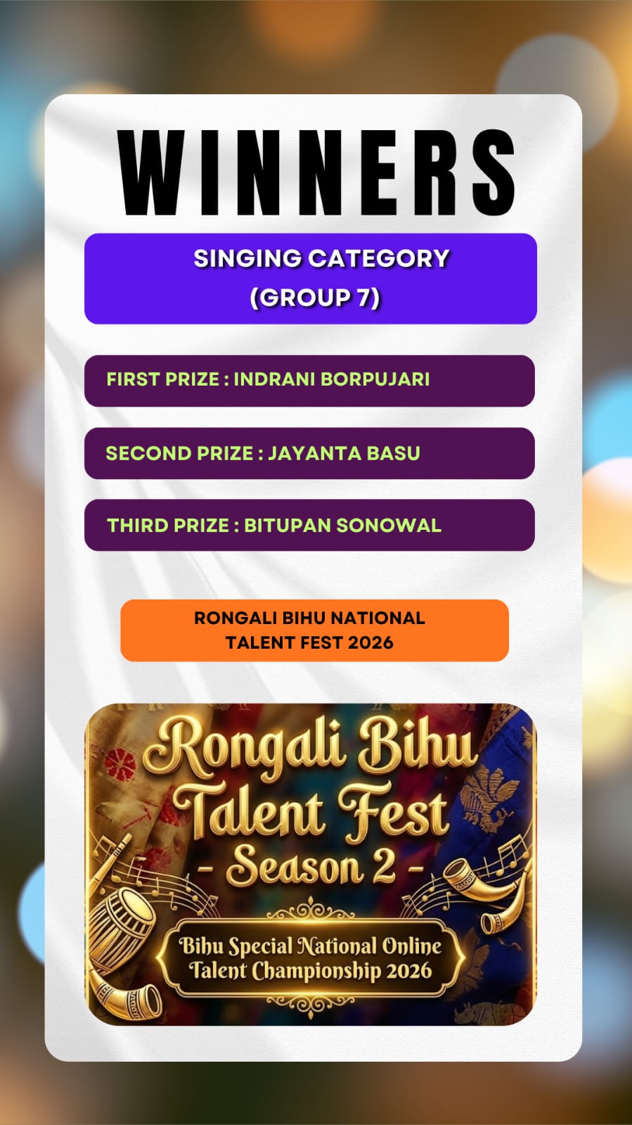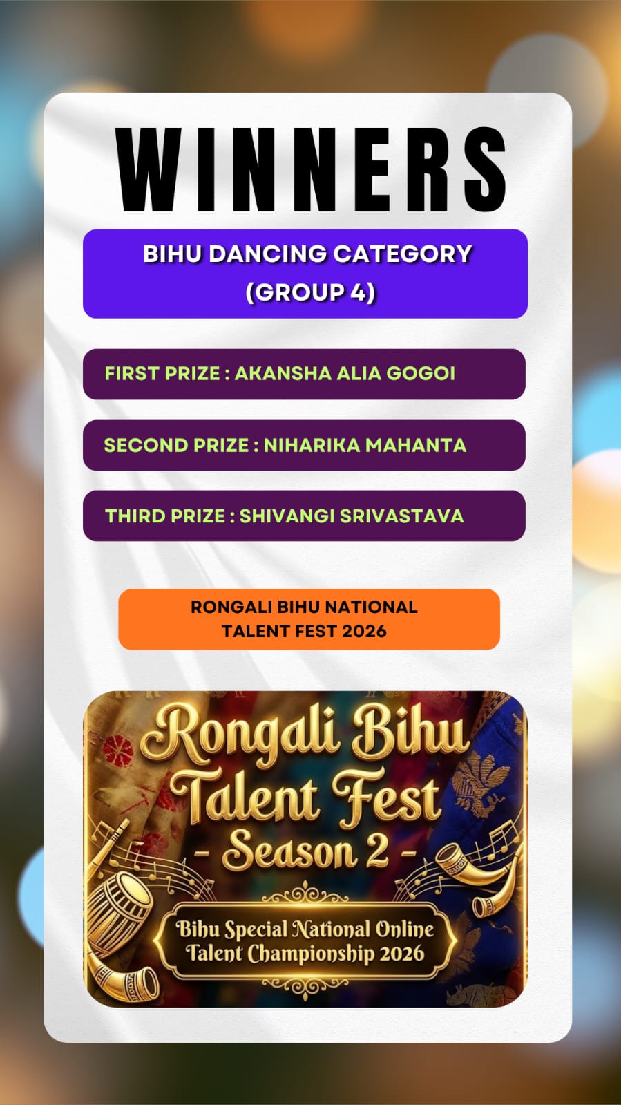 Here we brought to you the results of the Talent Hunt Contest title "Rongali Bihu National Talent Fest 2026 Results ".